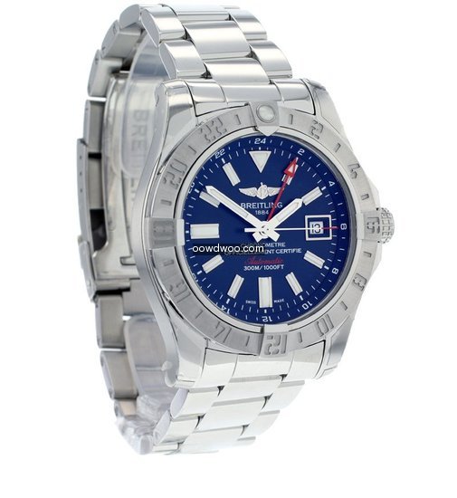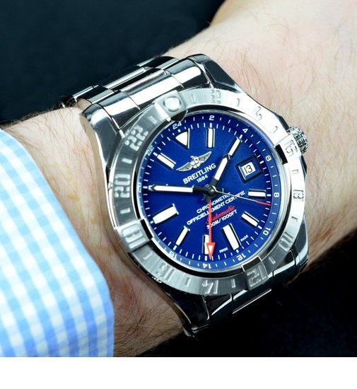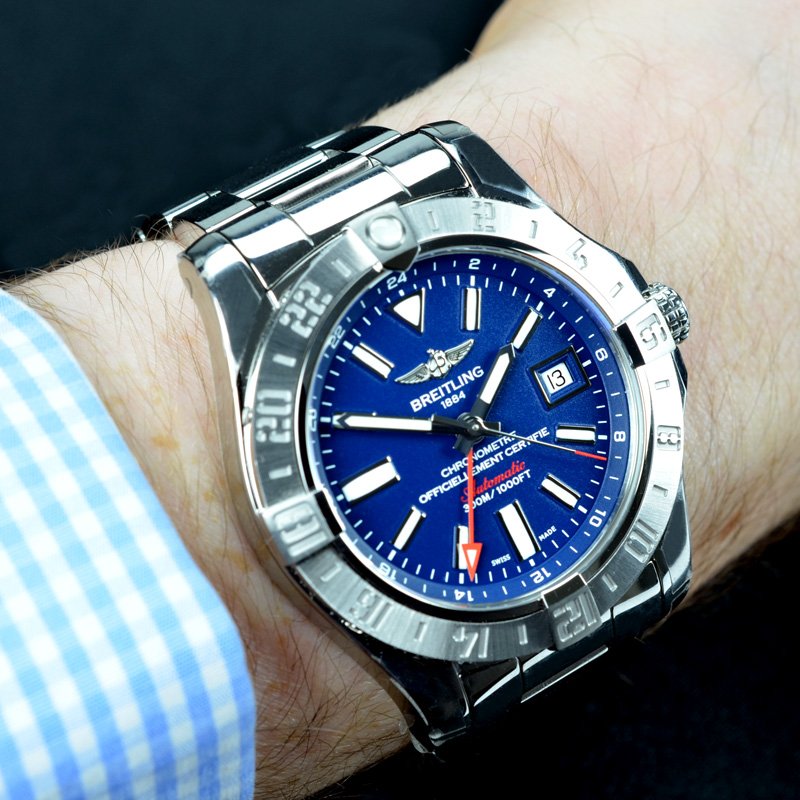 Never worn, this Breitling Avenger II GMT still has the protective stickers intact on the watch and has the benefit of being covered by the Breitling manufacturers warranty until February 2019. Featuring a dramatic dark blue matte dial with luminous hour markers, date window and bold red accents on the hands and dial.