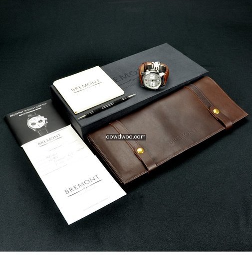 A complete set, this watch comes with all original boxes, instructions, warranty and chronometer certificate, brown leather presentation saddle style pouch with adjustment tool. Presented on a brown leather strap vintage style strap on a steel Bremont deployment clasp.