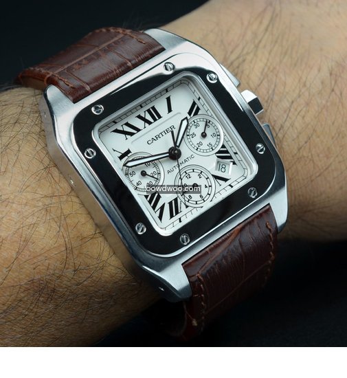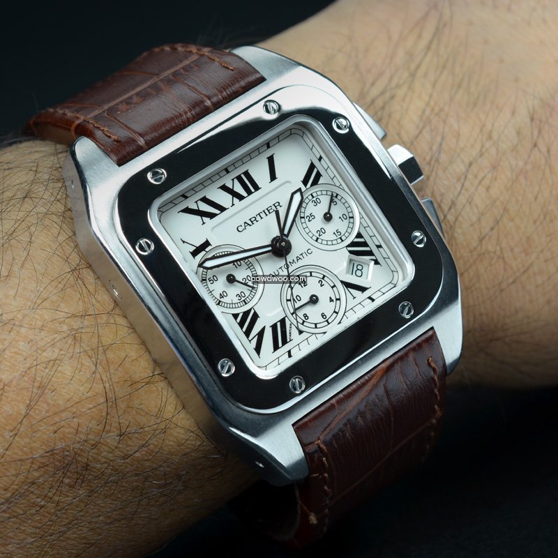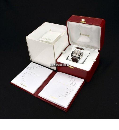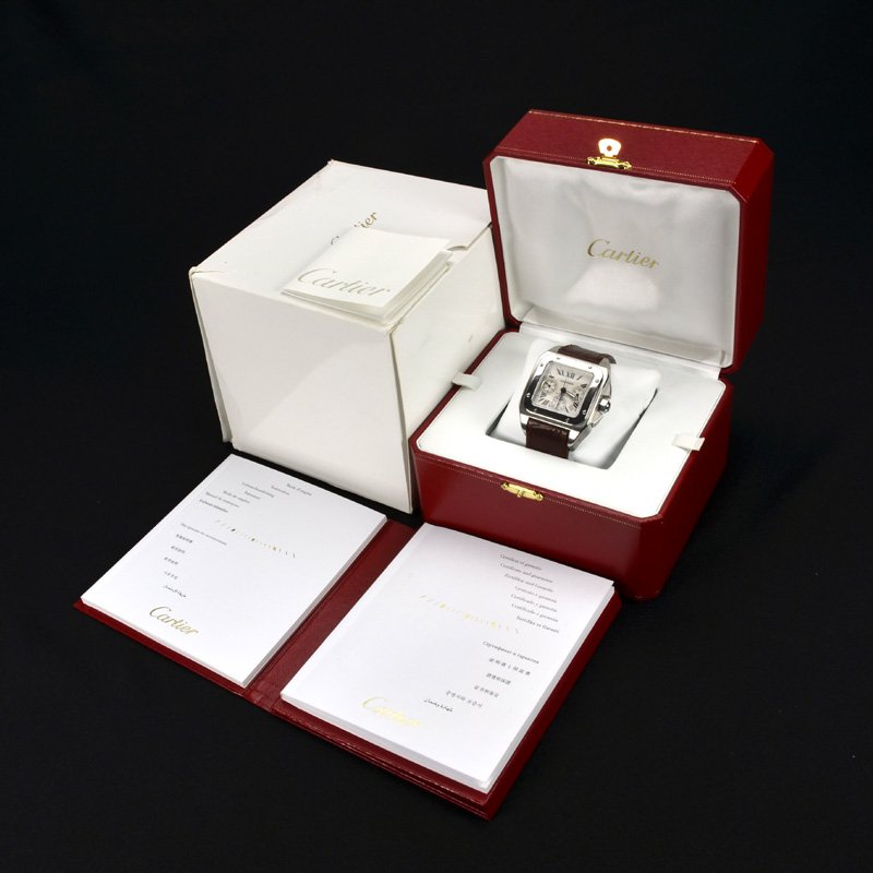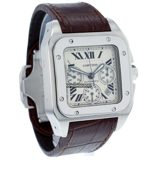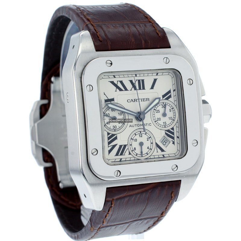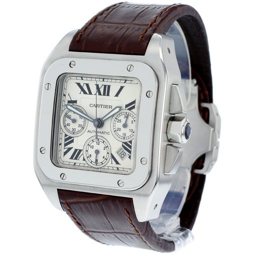 A very smart and modern Cartier Santos 100 Chronograph, supplied here in Mint condition and with all original boxes and paperwork. Featuring a silver opaline dial, with black gloss roman numeral hour markers, three sub-dials and an eye-catching polished stainless steel square bezel. This watch has a chronograph function and has a robust stainless steel case.