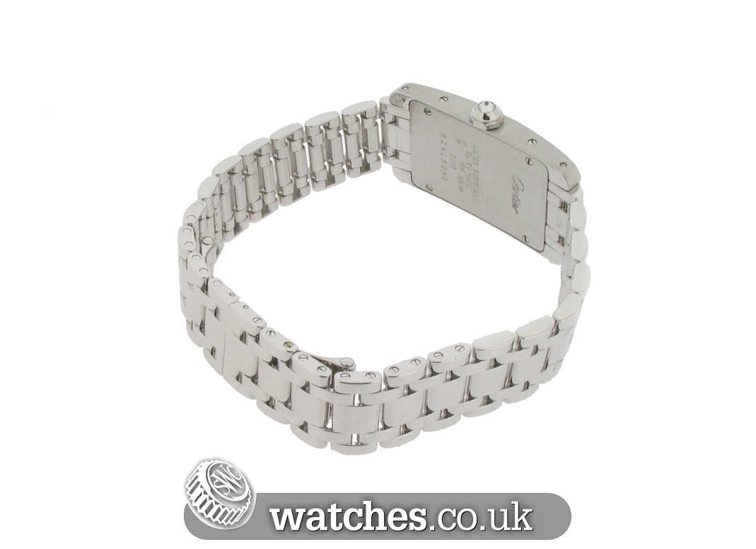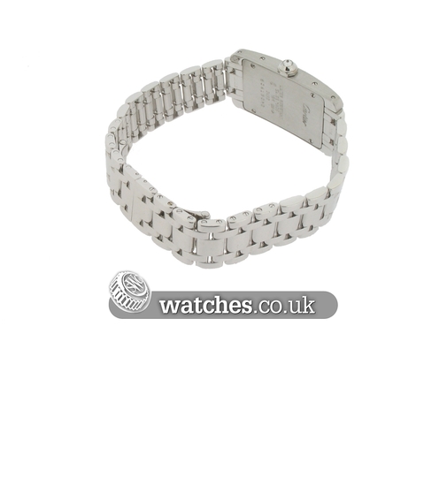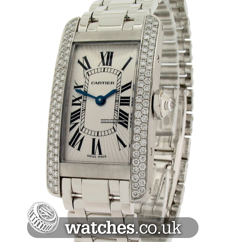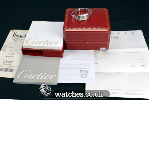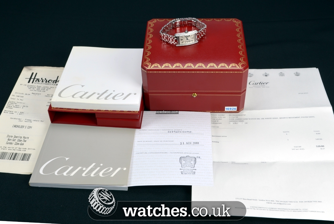 The Tank Americaine features an elongated case with a more pronounced curve than the original model. It updates the geometry of the lines, retaining the rectangular form while alternating between round edges and angles. A elegant and classic design.A stunning watch, this Ladies Tank Americaine has just returned from Cartier having undergone a complete service and polish and is still under the Cartier manufacturers warranty until July 2016. As expected, the watch is in mint condition. It is supplied with the original Cartier boxes (white outer card box is absent), instruction manual and warranty book.The watch is also supplied with the original purchase receipts from Harrods and service documentation detailing the service completed in July 2015.