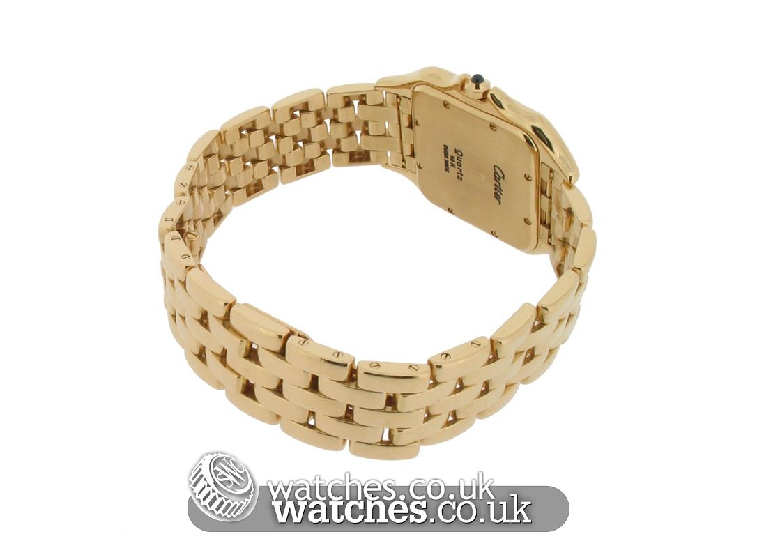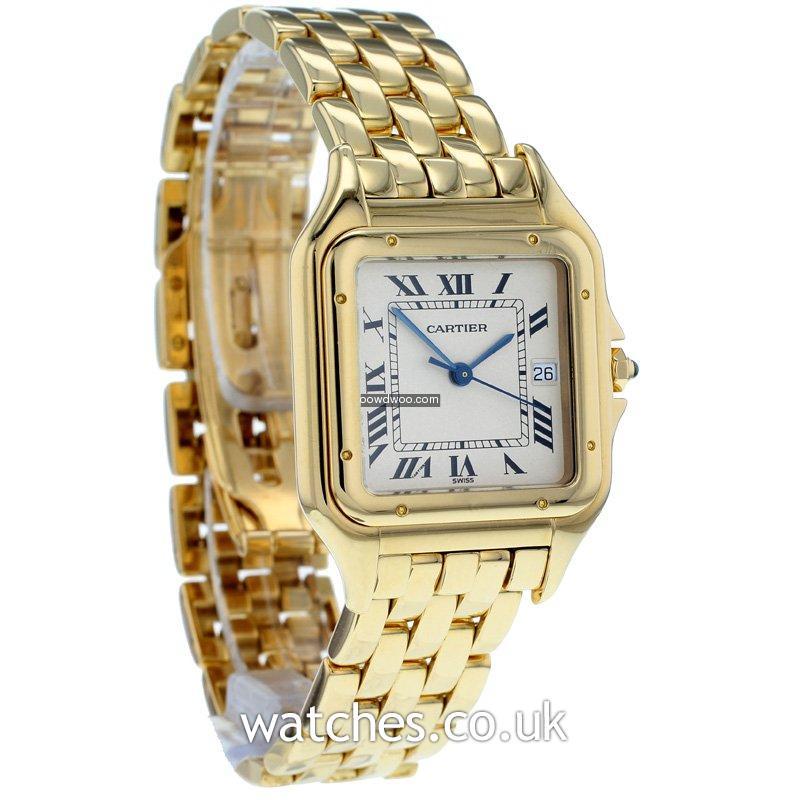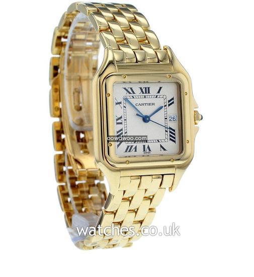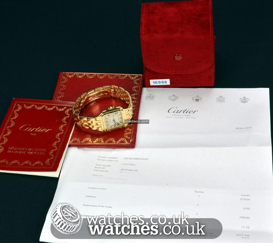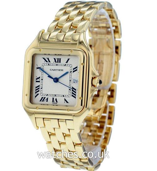 Beautiful and luxurious, this 18ct Gold Cartier Panthere has been fully serviced directly by Cartier UK in June 2015. Receipt and letter of servicing from Cartier UK supplied.Featuring a polished 18ct gold case, bezel and bracelet, with a silver dial and blue steel hands, this timepiece has all the iconic detailing you would expect from a Cartier watch, including the blue cabochon spinel on the crown.The dial features the classic black art deco roman numeral hour markers with a date window. Presented in a Cartier service pouch, with original instruction booklet and proof of servicing dated 2015.
