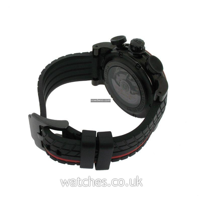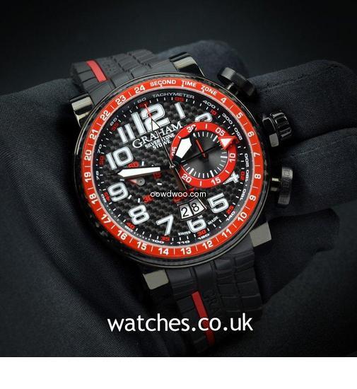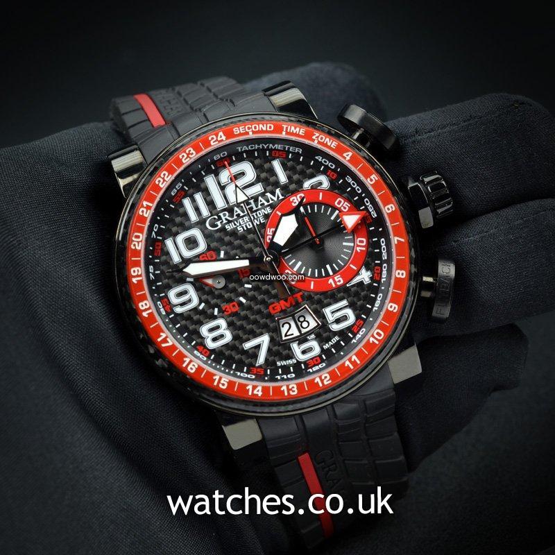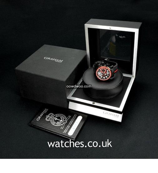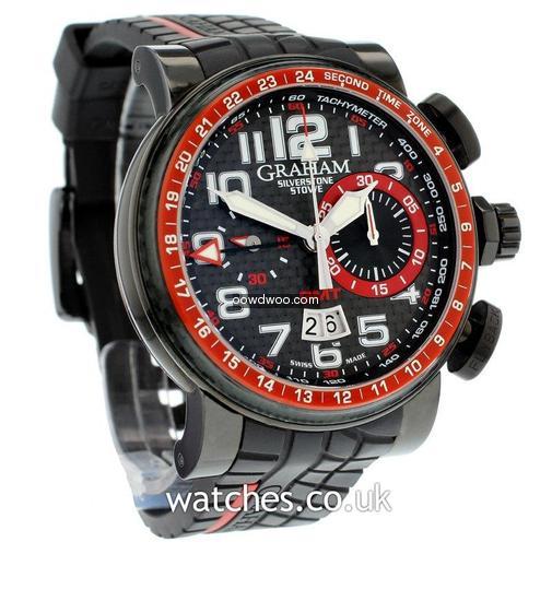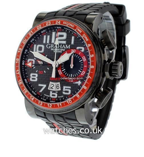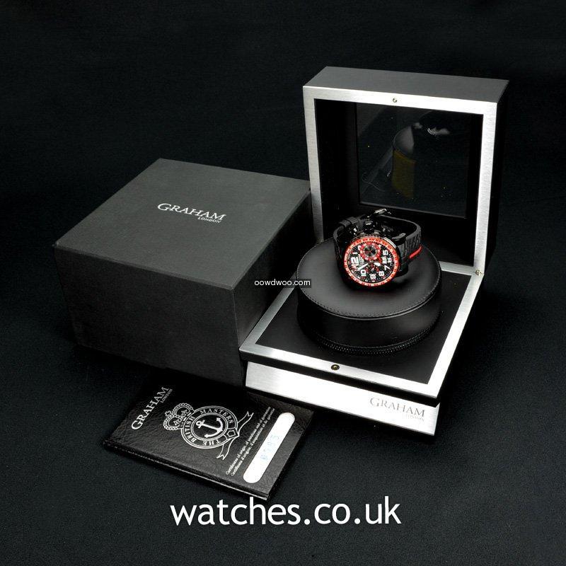 Named after the world famous Silverstone race track, this motorsport inspired watch comes on a tyre tread rubber strap with a sleek black PVD case housing a carbon fibre dial and bezel. Never worn, this watch is supplied with the original Graham boxes and Graham passport.